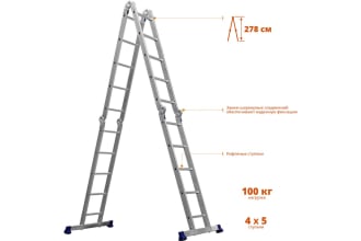 Лестница трансформер Kroft применяется для работы на высоте до 6,12 м при ведении строительства или ремонта. Представляет собой 4 лестничных секции, соединенных между собой фиксирующимися в нескольких позициях шарнирами. В результате лестница может принимать четыре положения. Модель выдерживает нагрузку до 150 кг. Количество ступеней — 5 шт. Страна производства — Россия.