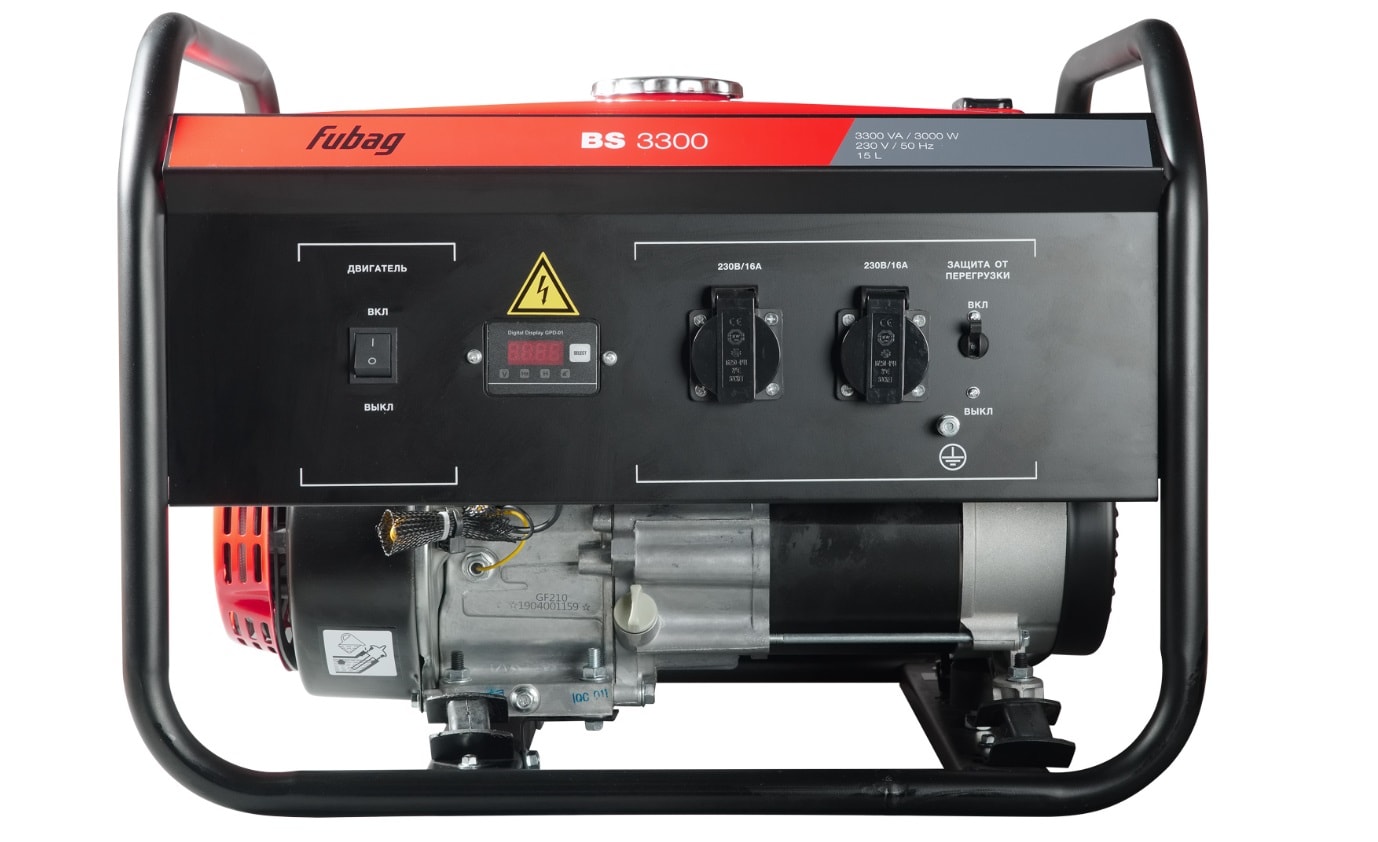 Обеспечит работу приборов освещения, холодильника, электроплиты или электроинструмента в течении 13 часов без дозаправки. Высокий ресурс работы генератора BS 3300 обеспечат профессиональный OHV-двигатель FUBAG с верхним расположением клапанов. Синхронный альтернатор с медными обмотками ротора и статора оснащен системой регулировки выходного напряжения (AVR), который гарантирует стабильное выходное напряжение и частоту тока. Двигатель и альтернатор установлены на раму через демпферы, позволяющие значительно гасить вибрации во время работы и перемещения генератора, увеличивая долговечность конструкции. Надежный сварной топливный бак объемом 15л оснащен указателем уровня топлива и фильтром-сеткой. Панель управления бензиновой электростанции Fubag BS 3300 оснащена двумя пыле/влагозащищенными розетками 220В/16А и системой защиты от короткого замыкания и перегрузки. Мультифункциональный цифровой дисплей позволит контролировать выходное напряжение и частоту, отслеживать межсервисные интервалы. Не забыть про очередно
